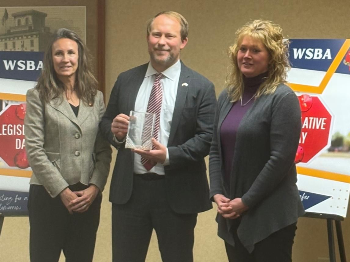 | Members of Destinations Wisconsin gather outside the Capitol before meeting with their local legislators. | | Cherie Hime from Wisconsin School Bus Association and Tina Karls from the New Holstein School District presented Rep. Tusler with the WSBA Legislative Champion Award at the Legislative Day event on January 28. | | |